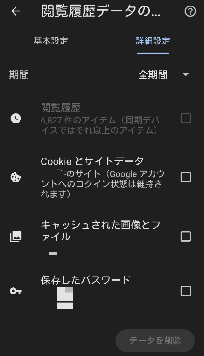 - 削除したいデータの種類を選んで、「データを削除」をクリック。