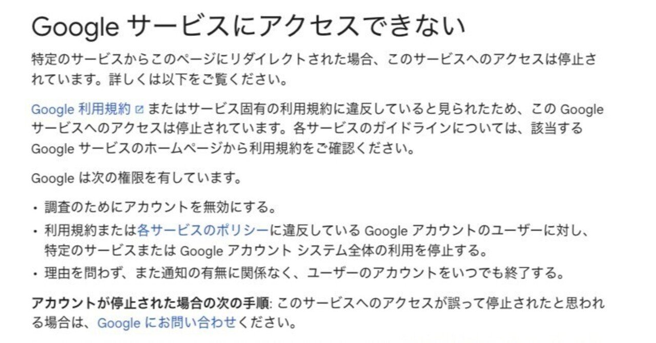 - 利用規約の違反:スパム行為や不適切なコンテンツの共有など、Googleのポリシーに違反するとアカウントが停止されることがあります。