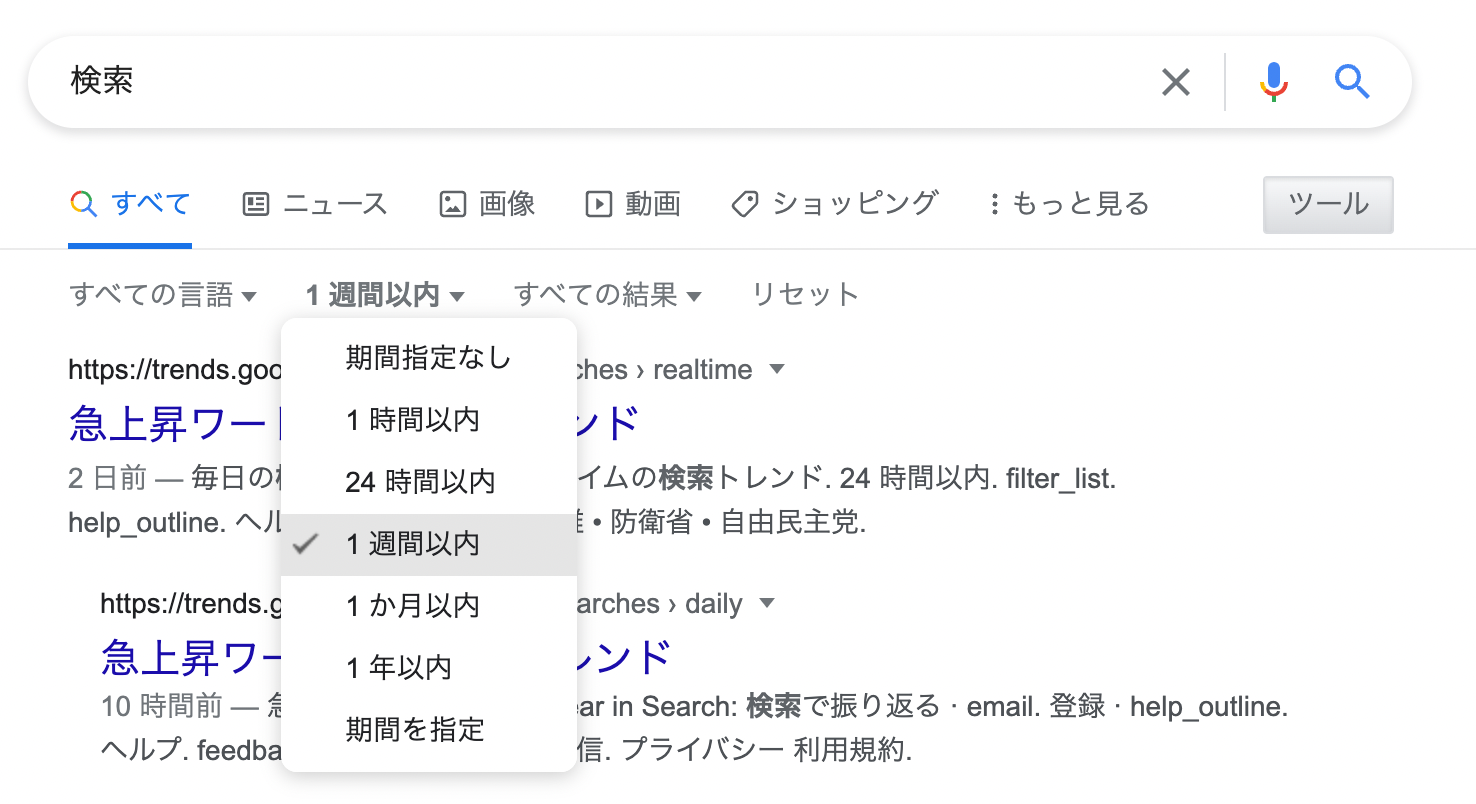 - 検索後のオプションを選択:検索結果が表示されたら、ページの上部にある「ツール」ボタンをクリックします。そこから「任意の時間」を選択し、「最近の情報」を選ぶことができます。