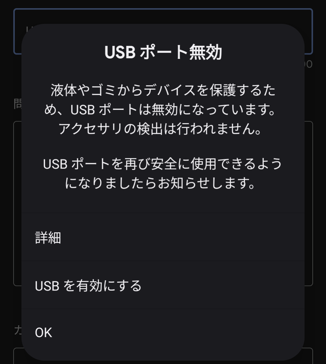 水分検出エラーは、USBポート内に水や湿気が入り込んだ時に発生します。このエラーが消えない場合、以下の基本的な対処法を試してみてください。