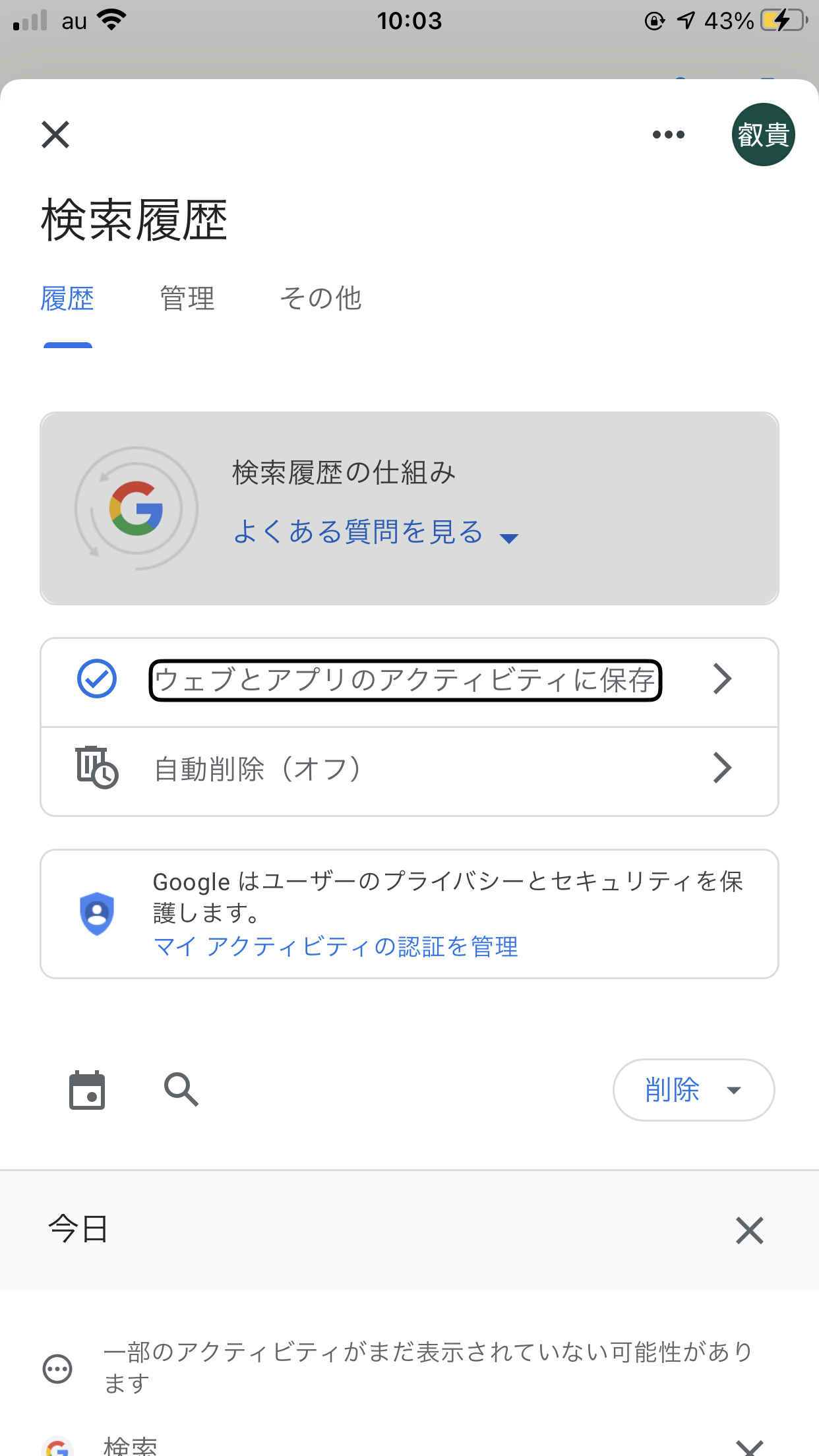 1. 設定 → Google → アクティビティ管理 に移動します。